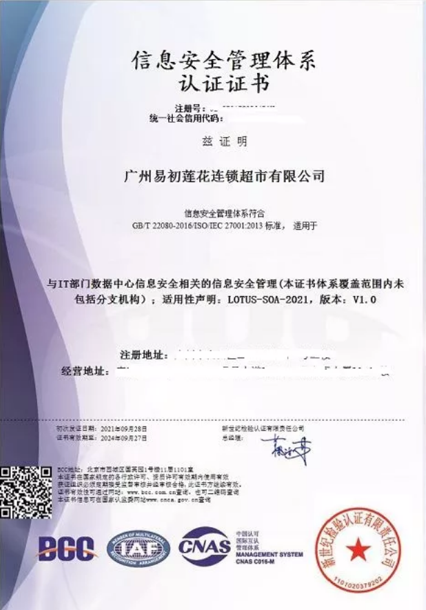 本次獲得BCC頒發(fā)的信息安全管理體系認(rèn)證證書,標(biāo)志著廣州易初蓮花在識別信息安全風(fēng)險,減少可能存在的信息安全隱患,提升員工信息安全意識,實現(xiàn)良性發(fā)展方面又邁進一步!