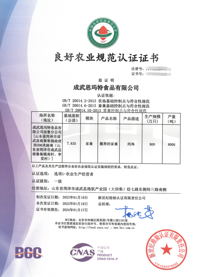 讓雞肉產(chǎn)品更具競爭力!成武思瑪特通過BCC實施的GAP(家禽模塊)認證