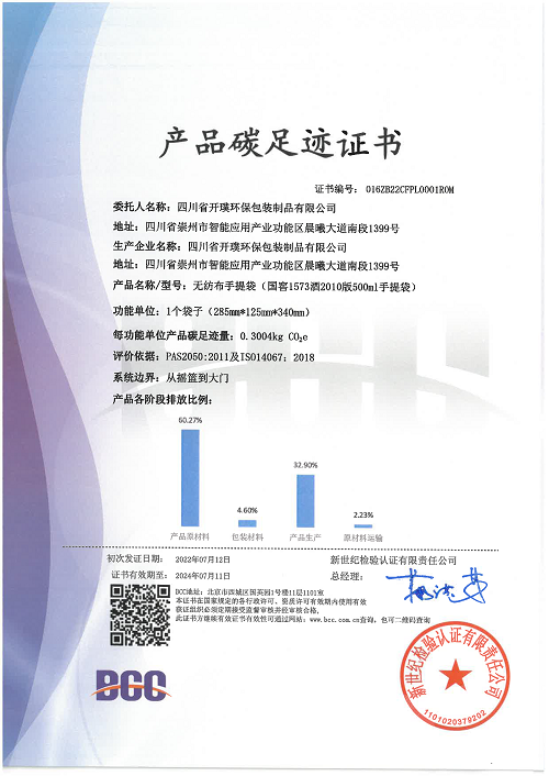 為響應(yīng)國家政策、履行社會責(zé)任,四川省開璞環(huán)保包裝制品有限公司(以下簡稱:開璞環(huán)保)日前順利通過產(chǎn)品碳足跡核查,并獲得了BCC頒發(fā)的“產(chǎn)品碳足跡證書”。