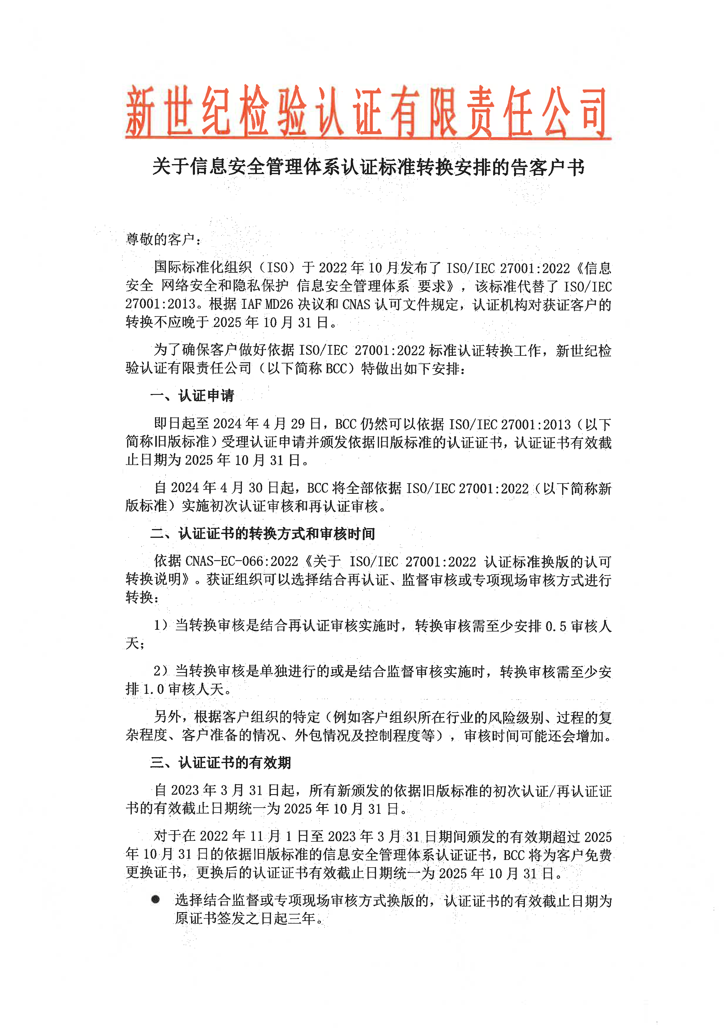 關于信息安全管理體系認證標準轉(zhuǎn)換安排的告客戶書
