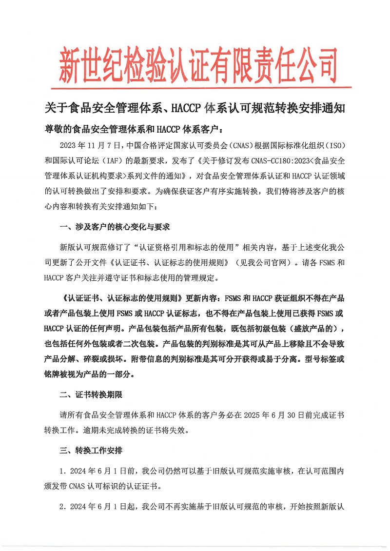 關于食品安全管理體系、HACCP體系認可規(guī)范轉(zhuǎn)換安排通知