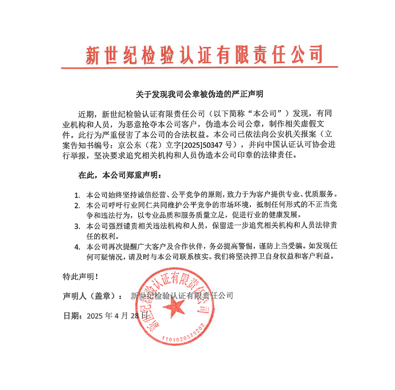 近期,新世紀(jì)檢驗(yàn)認(rèn)證有限責(zé)任公司(以下簡(jiǎn)稱(chēng) “本公司 ” )發(fā)現(xiàn),有同業(yè)機(jī)構(gòu)和人員,為惡意搶奪本公司客戶(hù),偽造本公司公章,制作相關(guān)虛假文件。此行為嚴(yán)重侵害了本公司的合法權(quán)益。本公司已依法向公安機(jī)關(guān)報(bào)案(立案告知書(shū)編號(hào): 京公東(花)立字[2025]50347號(hào)),并向中國(guó)認(rèn)證認(rèn)可協(xié)會(huì)進(jìn)行舉報(bào),堅(jiān)決要求追究相關(guān)機(jī)構(gòu)和人員偽造本公司印章的法律責(zé)任。