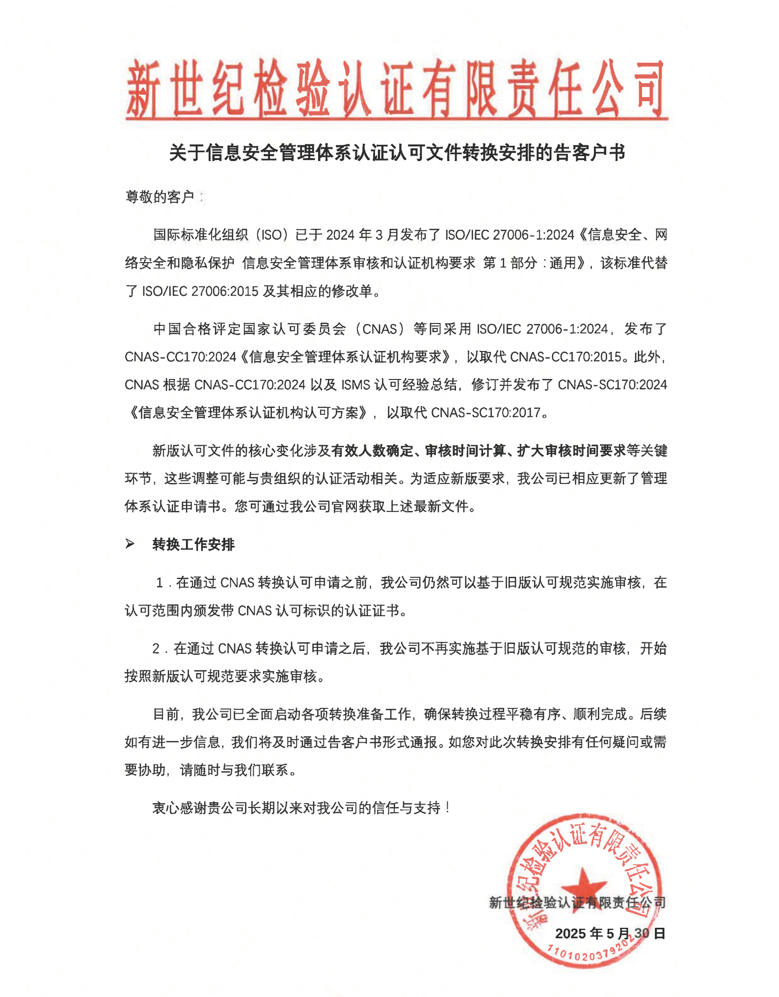關于信息安全管理體系認證認可文件轉(zhuǎn)換安排的告客戶書