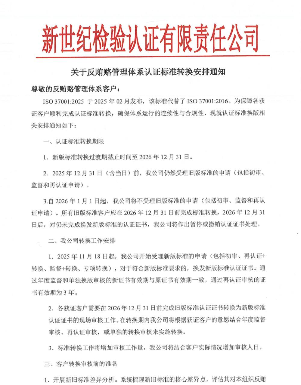 3.自2026年1月1日起,我公司將不受理舊版標(biāo)準(zhǔn)的申請(qǐng)(包括初審、監(jiān)督和再認(rèn)證申請(qǐng))。所有舊版標(biāo)準(zhǔn)客戶應(yīng)在2026年12月31日前完成標(biāo)準(zhǔn)轉(zhuǎn)換,2026年12月31日后,對(duì)仍未完成換發(fā)新版標(biāo)準(zhǔn)的認(rèn)證證書,我公司將作出暫?;虺蜂N認(rèn)證證書處理。