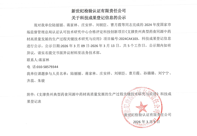 現(xiàn)對(duì)我單位陸麗麗、蔣家林、莊安祥、劉朝臣、曹月霞等同志完成的2024年度國(guó)家市場(chǎng)監(jiān)督管理總局認(rèn)證認(rèn)可技術(shù)研究中心合格評(píng)定科技創(chuàng)新項(xiàng)目《支撐貴州典型藥食同源中藥材高質(zhì)量發(fā)展的生產(chǎn)過(guò)程關(guān)鍵技術(shù)研究與應(yīng)用》項(xiàng)目編號(hào):2024CAK103,科技成果登記信息進(jìn)行公示,公示日期:2026年3月09日-2026年3月13日,共5個(gè)工作日,公示期內(nèi)如有異議,請(qǐng)實(shí)名提交書面異議材料至法務(wù)技術(shù)部。