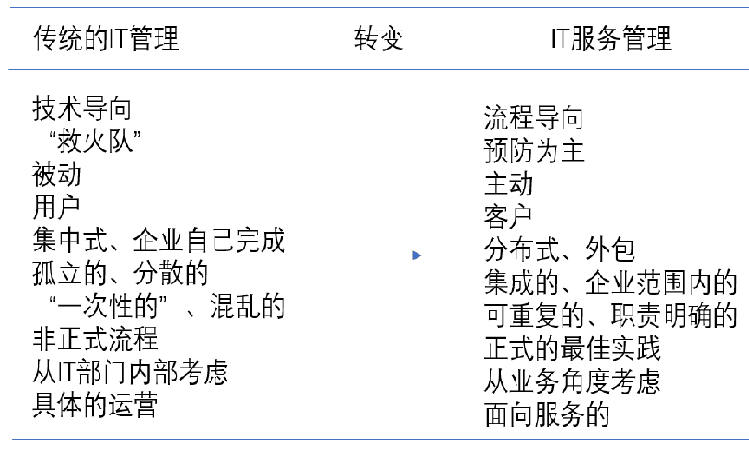 根本出發(fā)點在于通過 IT 服務有力的支持企業(yè)的發(fā)展以及業(yè)務部門業(yè)務的開展,促進企業(yè)競爭力的有效提升。在 IT 管理當中,IT 服務管理屬于不可或缺的構成部分。但是IT 服務管理有別于傳統(tǒng)的 IT 管理,其存在的意義在于將基于服務之上的 IT 管理提供給購買 IT 服務的企業(yè)或內部部門。